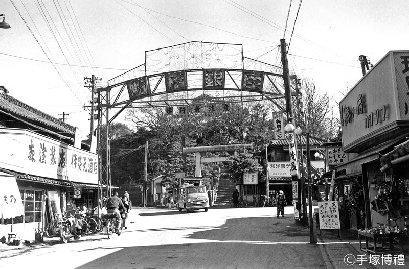大神宮の古い写真をお借りする事が出来たので、ここでご紹介いたします。こちらは、昭和31年撮影の大神宮下交差点の写真です(写真撮影:手塚博禮氏)。今とは違い自動車の交通量は少なかったらしく、歩道と車道の区別はまだ無かったようです。看板には今でも本町通りで目にする名前も見え、時代を異にしても、ここが船橋の本町通りの風景であることを思わせます。