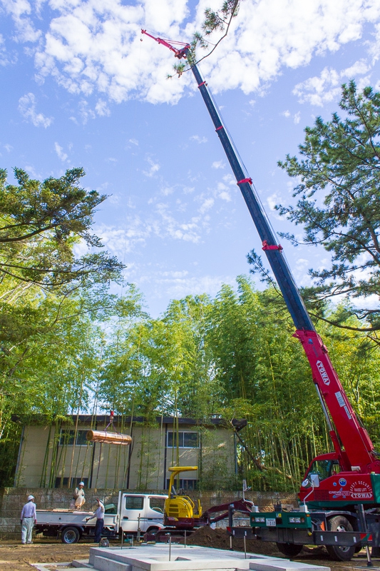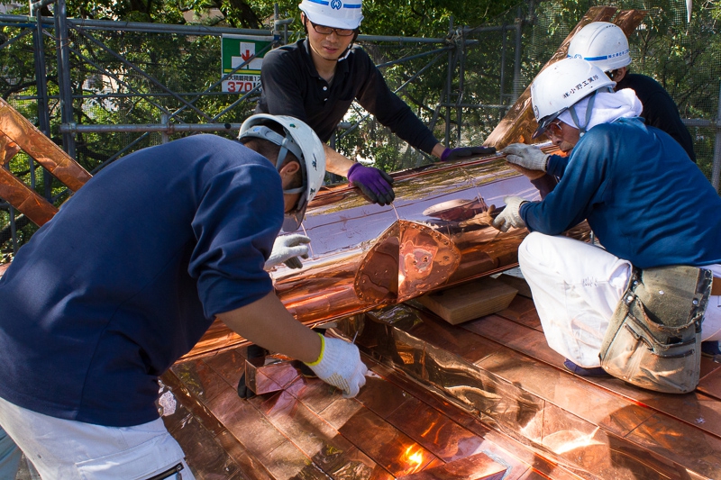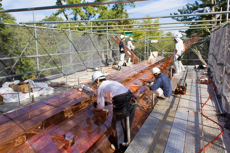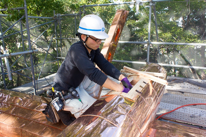 常磐神社の造営工事と並行して、本殿の屋根修復工事が行われました。 長年の風雪により腐食した銅板を張り替え、飾り金具を新たに据え付けました。 本殿を足場で覆い尽くしての工事でしたので、足場が取れ現れた新たな本殿の佇まいに、驚かれた方も多いのではないでしょうか。 以下に工事の様子の一部をご紹介いたしますので、ご覧下さい。 (撮影:平成26年10月3日)