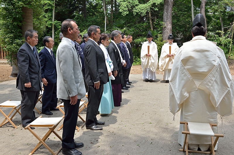 梅雨時ゆえ空模様が心配されましたが、当日は晴天の中、船橋市漁業協同組合、株式会社社寺建築研究所、株式会社大林組、更には船橋大神宮氏子総代の各位にご参列いただき、竣工までの工事の安全を祈願いたしました。