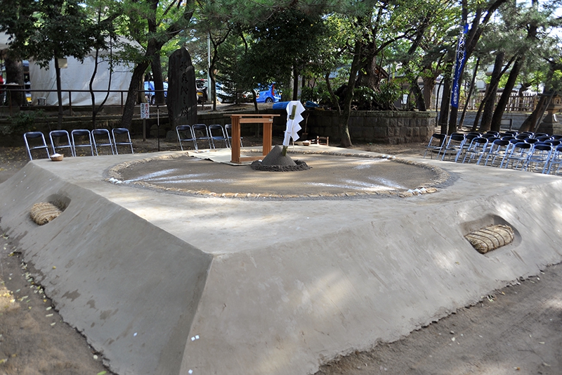 平成28年5月現在、鳥居向かって右側は更地になっておりますが、新たな建物の建築計画もあるようです。変わりゆく船橋の街並みに対し、変わらぬ大神宮の対比が見て取れる写真です。