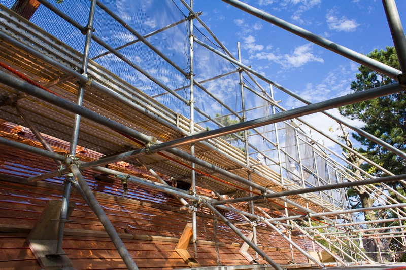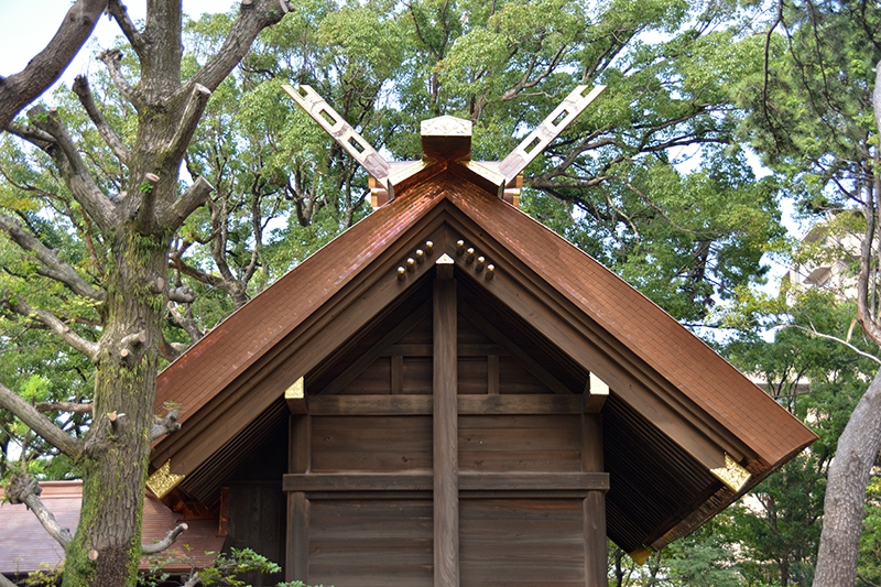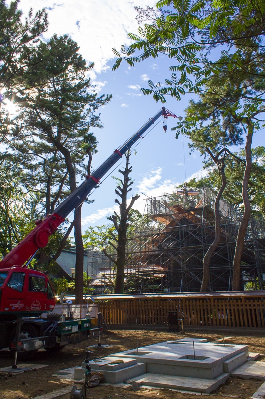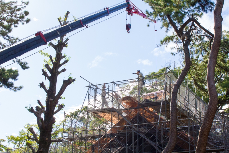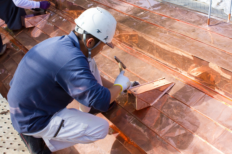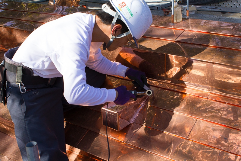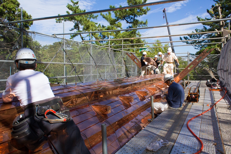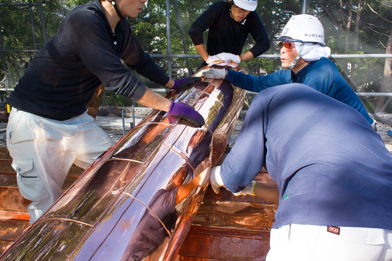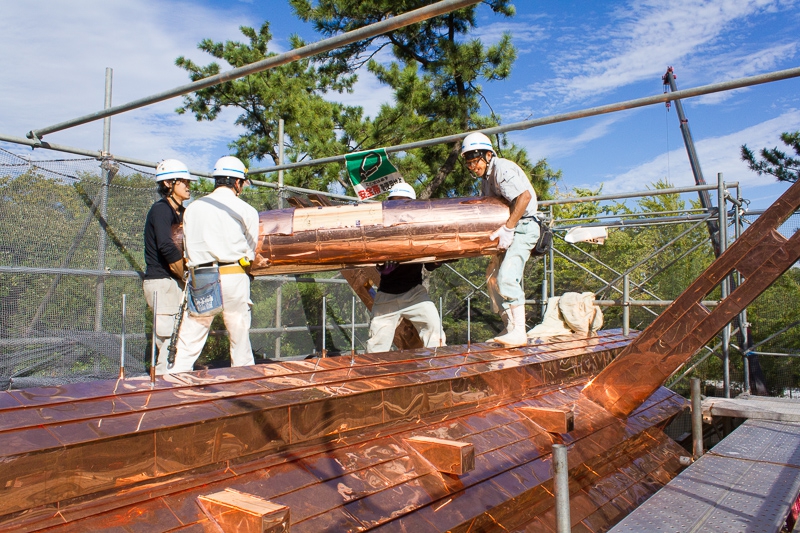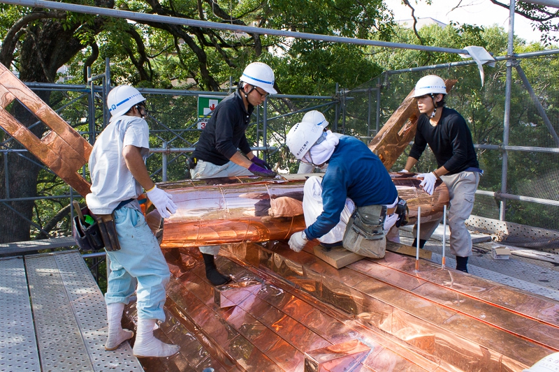 常磐神社の造営工事と並行して、本殿の屋根修復工事が行われました。 長年の風雪により腐食した銅板を張り替え、飾り金具を新たに据え付けました。 本殿を足場で覆い尽くしての工事でしたので、足場が取れ現れた新たな本殿の佇まいに、驚かれた方も多いのではないでしょうか。 以下に工事の様子の一部をご紹介いたしますので、ご覧下さい。 (撮影:平成26年10月3日)