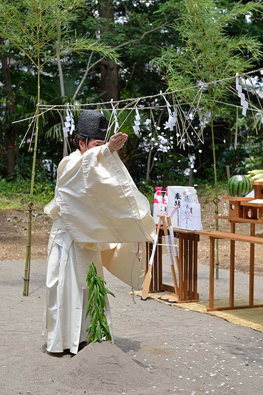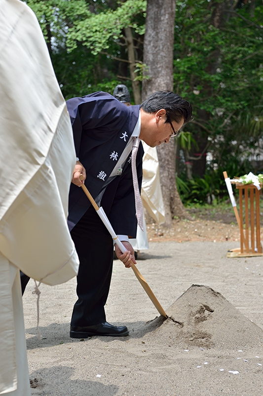 梅雨時ゆえ空模様が心配されましたが、当日は晴天の中、船橋市漁業協同組合、株式会社社寺建築研究所、株式会社大林組、更には船橋大神宮氏子総代の各位にご参列いただき、竣工までの工事の安全を祈願いたしました。